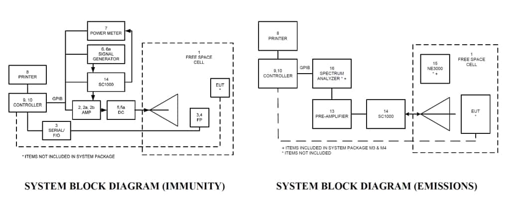 It is designed for applications requiring field strengths of up to 10 volts per meter (V/m) with 80%AM or 20 V/m CW. It consists of a solid state broadband RF power amplifier, a semi-anechoic test chamber, a broadband electric field monitoring probe, a signal generator, a power meter, dual directional couplers, an RF switch matrix, interconnecting RF cables and connectors and a system control PC pre-loaded with radiated immunity and emissions testing software to automate the testing process. It also includes a pre-amplifier and interconnecting cables for use with a user supplied Spectrum Analyzer.